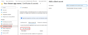 7. Wählen Sie in der Seitenleiste der App-Registrierung den Menüpunkt "Zertifikate & Geheimnisse" aus, danach den Reiter "Geheime Clientschlüssel" und dann der Button "Neuer geheimer Clientschlüssel".